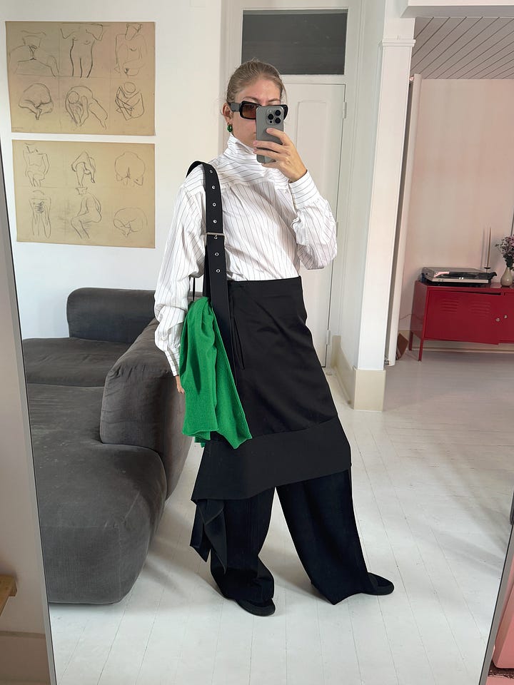 Like here - if I wear the shirt backwards, the whole silhouette changes. It suddenly feels very modern. That simple trick that I never thought to try brought back several shirts I hadn’t worn that often. It seems Phoebe Philo designed many of her shirts to be worn backwards - maybe Old Céline shirts in her later collections were also intended that way.
